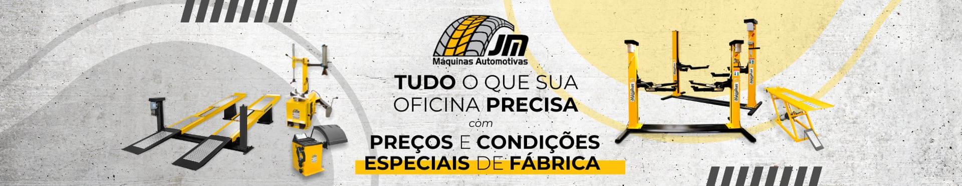 A JM Máquinas é a maior fabricante de máquinas automotivas do Brasil, desde 2000, são mais de duas décadas equipando grandes auto centers, oficinas e borracharias! Contamos com o que existe de melhor em máquinas e equipamentos no segmento. Você irá perceber que é possível unir qualidade, modernidade, praticidade e economia, ampliando seus clientes e oferecendo cada vez mais o melhor atendimento.